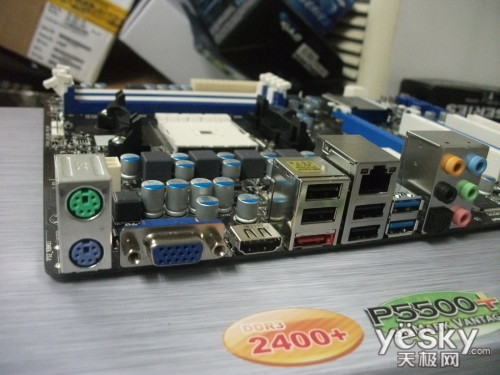 背板I/O接口上,映泰TA55MU3主板提供了PS/2键盘鼠标接口,2个USB2.0接口,2个USB3.0接口,HDMI+DVI+VGA接口,充分满足高清用户的需求。另外,主板还提供了一个Realtek RTL8111E千兆以太网卡接口和5.1声道HD声卡音频接口,非常实用。