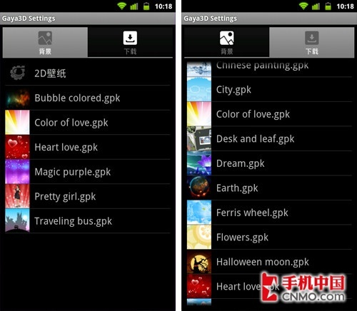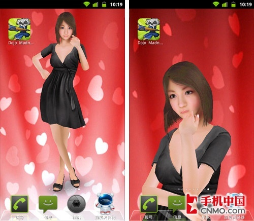GAYA 3D的3D效果不仅仅用户界面滑动,同时还表现在3D的动态背景,手机预置了几个比较清爽的动态壁纸,还有可供下载的动态壁纸库,里面有着超多动态壁纸选择。有个全3D仿真女孩的壁纸非常不错,还具备很强的互动性,是宅男必备神器,无论你怎么摸她都那么乖。