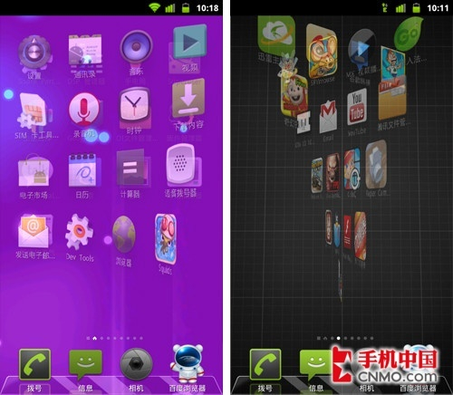 GAYA 3D桌面的图标翻页效果相当绚丽,而且有着很多的选择,大部分都是我们之前所没见过的,同时桌面添加文件夹的方式也与传统桌面有所不同,虽然桌面在设置功能上有所欠缺,但基本功能做得都很完善。