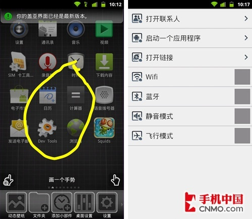 GAYA 3D采用了类似iPhone的桌面布局设计,刚刚装好默认情况下可能没有什么出彩之处,但当我们点击设置键时,就发现这个桌面设计不一般,你可以自定义手 势来为桌面设计功能,比如写一个W表示Wi-Fi,设定好后,当你再次进入Wi-Fi时就可以直接在手势中写“W”。