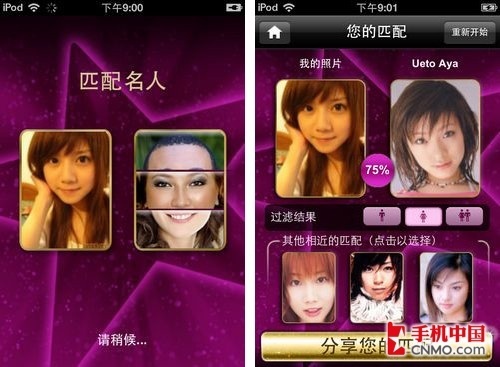 MyHeritage支持中文显示,因此在操作上没有任难度。在启动后选择第三项“MyCeleb”,玩家可以通过相机或者拍照来选择照片。系 统会根据所提供的照片自动匹配名人,并且给出相似度百分比。在节目中杜汶泽测试自己的照片,竟然和李连杰十分相像。这款软件搞笑效果并不是很强,但却是十 分有意思。