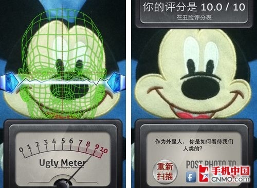 吴昕推荐的这款ugly meter(丑脸评分)是全场中笑点最多的软件,它让何炅、谢娜、维嘉大为惊喜,而推荐者吴昕最终却落得“报应”。其实ugly meter同样是一款整蛊软件,它的趣味之处在于可以分析照片中人物的五官,并且给出相应的分数,分数越高说明越丑,分数越低则越接近完美,其中10分为 最丑、0分最美。