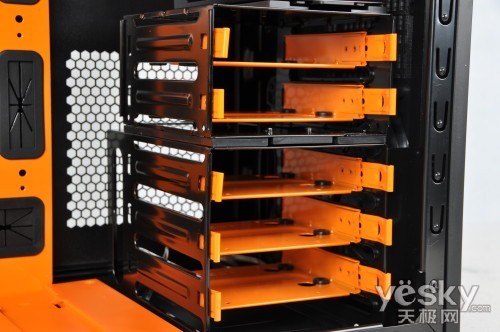 为了方便硬盘的拆卸,机箱的硬盘架能简易拆卸,用户只需要稍微用力把扣具往上提即可卸下硬盘架,在安装好硬盘后再放回原位,如此便无需打开机箱两面的挡板,这也算是一种比较人性化的易拆卸技术。