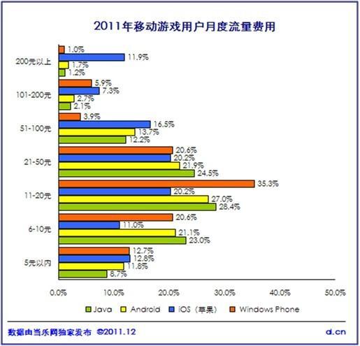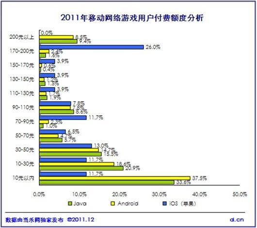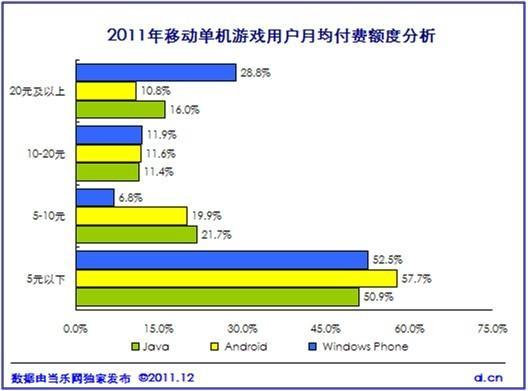 《中国2011年度移动游戏产业报告》解析(十)Java、Android单机游戏用户付费额度在5元以下所占比例高