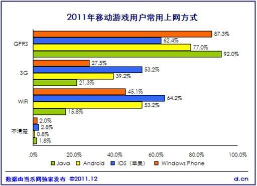 当乐网调研数据显示,随着3G进程的推进,2011年移动游戏用户选择上网的方式出现多样化趋势,但是传统的GPRS方式上网仍是用户的主要选择,不过从各平台用户分析仍有比较明显的差异,其中iOS平台用户利用WIFI上网的比例达到64.2%,Android用户使用WIFI的比例也达到53.2%。