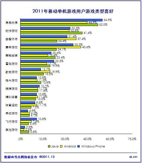 当乐网调研数据显示,单机游戏中Java终端用户在游戏选择上倾向于角色扮演类、动作类、益智休闲类,占用户比例分别为52%、41.4%、24.4%;Android用户的选择则是角色扮演类、赛车类、益智休闲类,比例分别为44.9%、40.6%、37.4%;Windows Phone用户的选择是角色扮演类、赛车类、动作类,比例分别为54.9%、35.3%、33.3%。