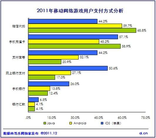 当乐网调研数据显示,移动网络游戏目前的支付方式在2011年有一定的发展,但短信代扣与手机充值卡仍然是移动网络游戏用户最为重要的支付方式。