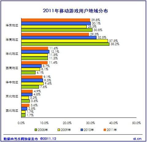 《中国2011年度移动游戏产业报告》解析(二)移动游戏用户分布华南地区首次超越华东地区