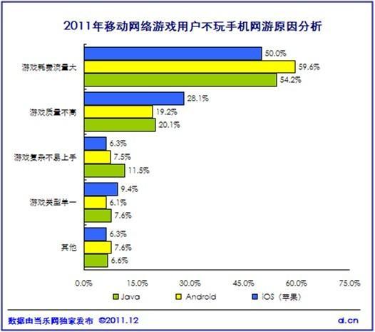 当乐网调研数据显示,对于流量费用问题的关心是用户不玩网游最大的瓶颈。各平台用户均超过半数是因为游戏耗费流量大而放弃玩网游,其中Java用户比例为54.2%,Android用户比例为59.6%,iOS用户比例则为50%。预计随着通信运营商的上网资费不断下调,未来流量费用的影响将逐步减弱。