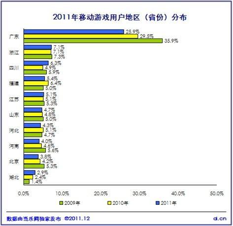 当乐网调研数据显示,2011年移动游戏用户地区分布的集中度发生变化,用户地区分布分散化趋势更加明显,其中广东省用户占比为25.9%,较上一年度下降3.6%,为本年度下降最大的用户群体。