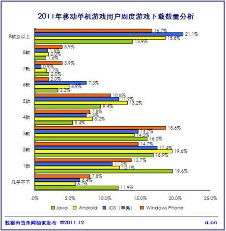 《中国2011年度移动游戏产业报告》解析(七)iOS(苹果)与Android单机游戏用户下载游戏数量最大
