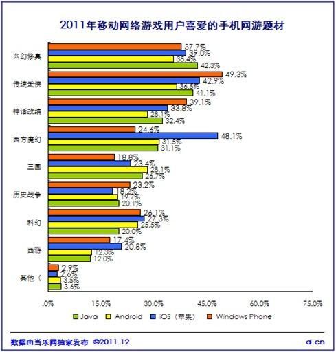 当乐网调研数据显示,网络游戏中Java平台用户仍是以玄幻修真、传统武侠、神话改编为最主要的三个类别,分别达到42.3%、41.1%、32.4%;Android用户排名前三的题材为传统武侠、玄幻修真、西方魔幻,比例为36.5%、35.4%、31.5%;iOS平台用户排名前三的题材为西方魔幻、传统武侠、玄幻修真,比例分别为48.1%、42.9%、39%;Windows Phone平台用户前三的题材则为传统武侠、神话改编、玄幻修真,比例分别为49.3%、39.1%、37.7%。