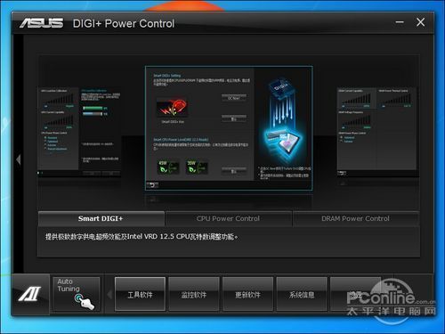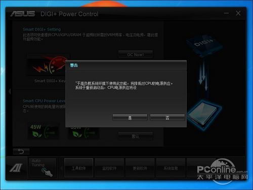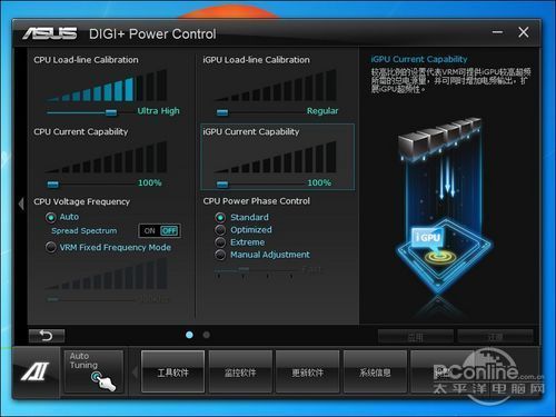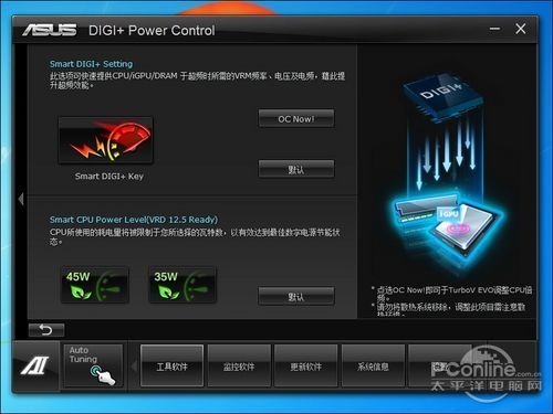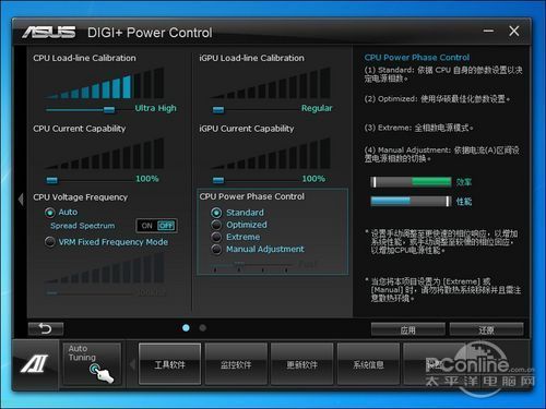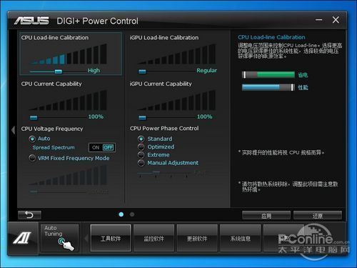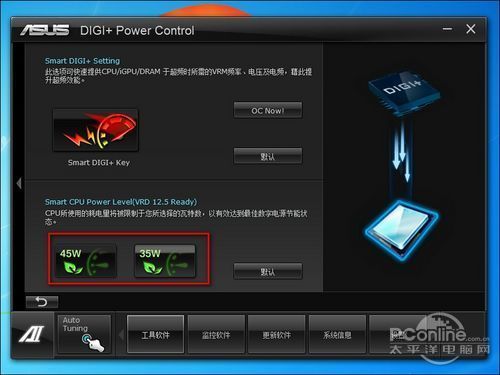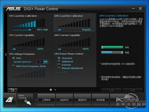 IVB处理器支持VRD 12.5标准,可以按需配置TDP,听起来可能有点复杂,以华硕的设计体验出来,就是软件下方的智能CPU节能模式,一键开启45W或35W省电模式,非常人性化。