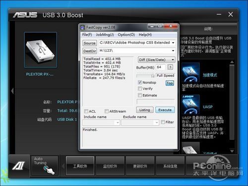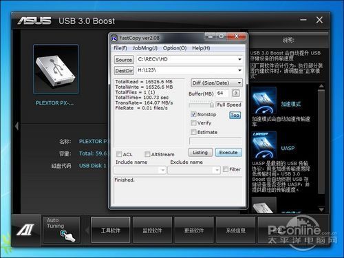 点评:华硕的USB3.0加速软件还是挺有效的,以笔者传输35GB的需要来算,没有加速要大概3分钟时间,有了加速只需2分钟出头,这或许只是一个小数字,但是,有末班公汽和没公汽,可能也就这么个小数字的差异而已。