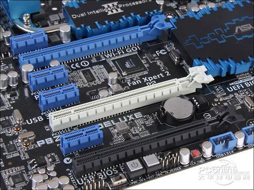 消费用的7系列主板和6系列主板一样,不具备PCI插槽,这款主板一共有3条PCI-E x16显卡插槽和4条PCI-E x1扩展插槽,搭配IVB处理器时能够支持PCI-E 3.0标准,并且可以支持PCI-E 3.0的x8+x8双卡互联或x8+x4+x4的三卡互联,扩展能力还是不错的。