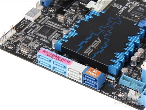 主板配备8个SATA磁盘接口,其中4个浅蓝色的是SATA2.0接口,2个白色的是原生SATA3.0,此外还有两个深蓝色的是第三方的SATA3.0,支持华硕独家的固态硬盘缓存加速,能用固态硬盘为机械硬盘加速,而且不需要重装。