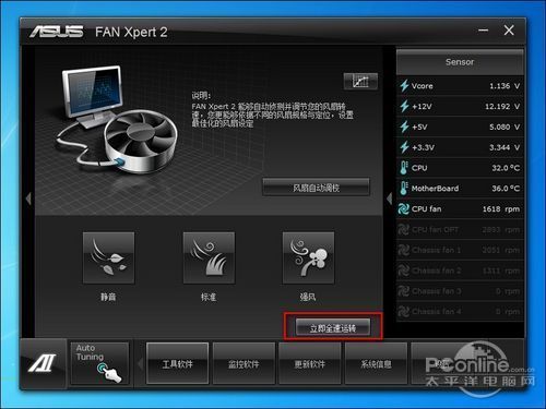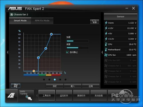 需要提示的是,这些模式都是常规情况下有效的,如果传感器感应到CPU或系统温度开始超过阀值,那么软件还是会给风扇加速来强化散热的,非常智能化。
