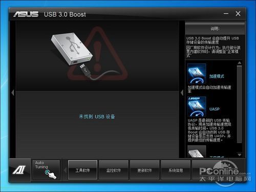 Z77原生支持USB3.0的确是个好消息,但是其性能表现并没有出人意料,因此华硕推出了USB3.0加速软件,能够自动侦测连接设备的类型,自动选择一般的加速模式,或者更神速的UASP模式,加速文件传输,降低传输所需时间。这项功能可以在原生USB3.0或者第三方USB3.0上使用。