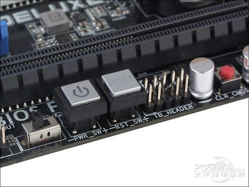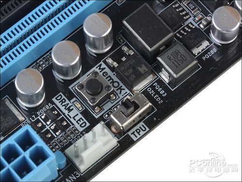 主板的内存插槽边有MemOK!按键,可以快速恢复超频失败的内存设定,优化平台的内存兼容性。此外这里还有一个TPU开关,能快速完成超频,轻度提升性能。