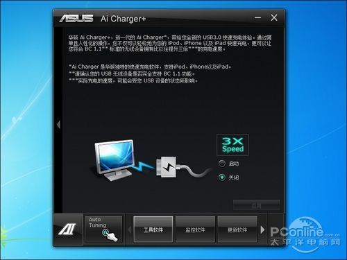 华硕主板支持特色的Ai Charger+快充,能提升充电速度最高达3倍,支持为iPod、iPhone、iPad等苹果“i”设备充电。