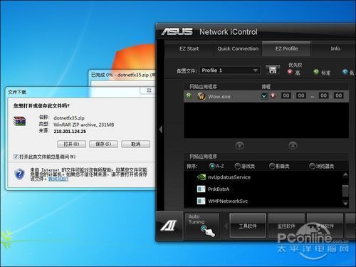 为了测试智能网络管理中心的效果,笔者设置了魔兽世界为最优先程序,然后把IE浏览器加到次要位置,然后再打开IE下载Win8预览版镜像+.Net 4.0安装程序两个文件,最后去打开魔兽玩游戏,看看表现如何。