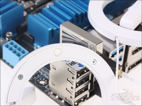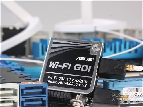 华硕多款Z77都配备了专用的WIFI无线网卡,华硕称之为“Wi-Fi Go!”,在这款主板来说是一个具备802.11 a/b/g/n多模的WIFI网卡和一个蓝牙V4.0/3.0+HS组成的整合无线功能卡,搭配华硕独家的乐趣无线软件,能够实现各种各样与平板、手机等 便携设备交互的功能。