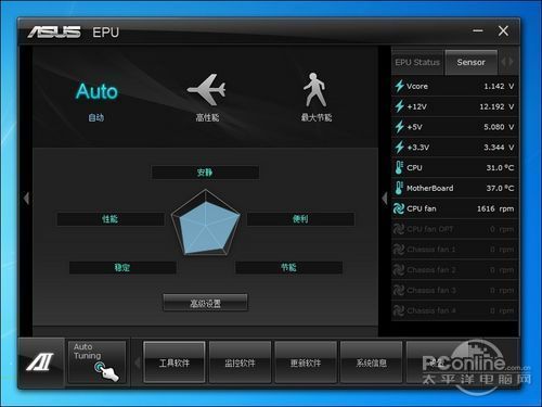 第3代智能数字供电的EPU设置界面和以前差别不大,有自动、高性能、最大节能三大选项可选。