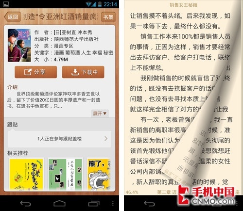 网易读书可以使用网易通行证同步你的阅读历史和书签,同时也可以对书的内容进行评价,参与跟帖与盖楼,如果碰到喜欢的书,更可以通过微博、短信等方式将书分享给其他好友,可以说是目前功能非常全面的阅读器,喜欢看书的朋友不妨尝试一下。