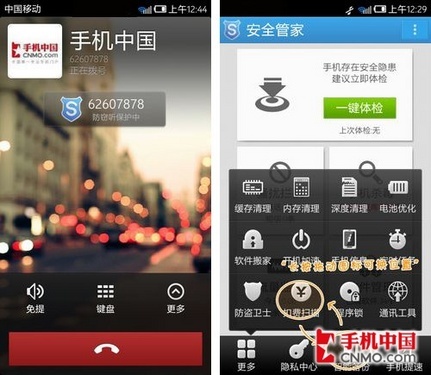 当手机逐渐成为掌上核心终端时,我们会发现手机中已经存储了很多个人隐私,比如文件、密码、联系人、短信等信息,其实正常的通话也是用户的一项 重要隐私。2.67版安全管家新加入了防窃听功能,当遇到手机通话呼出或者被叫时,安全管家的防窃听功能会自动启动,并在屏幕上显示。