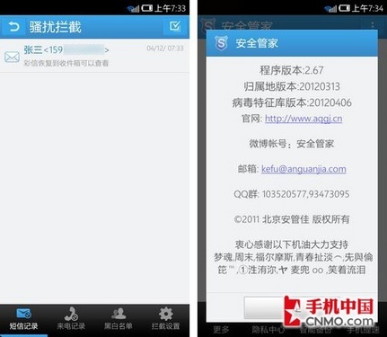 支持彩信拦截也是新版本安全管家的一项新功能,凡是被列入黑名单的联系人发来的彩信都将被安全管家拦截,用户可以在“短信拦截”中查看拦截记 录。另外,2.67版安全管家还有一些其他细节上的优化,基于新增的多项新功能与这些优化,建议老用户进行及时更新,而有金融保护、防窃听等需求的朋友也 不妨尝试一下。