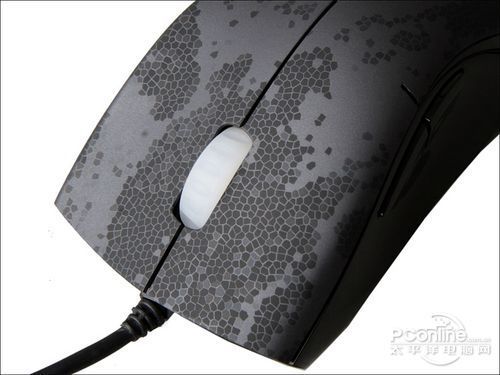 鼠标在安装设计上以标准的双按键单滚轮设计,左右键键面上布有大量的蛇纹纹理,起 到一定的防滑效果。