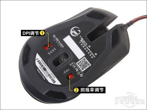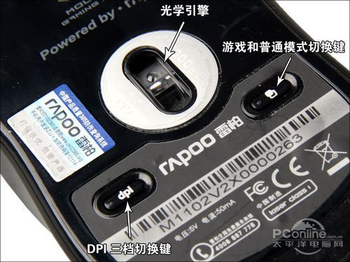 鼠标底部的细节上,有两个按键,其中DPI按键就是切换不同档位的DPI,而右边的按键是游戏和普 通模式的切换。普通模式只是普通鼠标,DPI固定在500、1000、2000三档,不可再自定义。而游戏模式可以自定义三档的DPI,数值可以 随意变化,最高可达3000DPI。