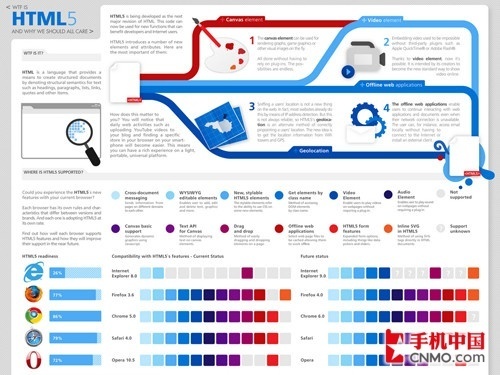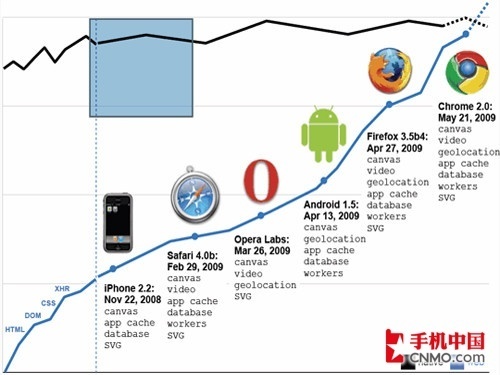 而各大厂商的浏览器产品也早早的为HTML5的发展铺好了道路,微软的Internet Explorer、苹果的Safari、谷歌的Chrome、Mozilla的Firefox以及Opera等主流浏览器的最新版本都对HTML5有了更 好的支持,在HTML5test的测试中都有着超过300分的高分,而Chrome的最新版本得分更是超过了400分,要知道这个测试的满分只有500 分。