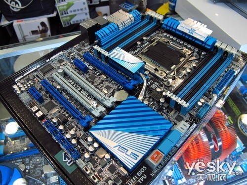 华硕 P9X79 Deluxe主板基于Intel最新Sandy Bridge-E平台X79单芯片组,支持LGA2011接口,采用了Extended ATX版型,方便发烧DIY玩家摆放夸张的8条内存和4块显卡。主板采用蓝黑配色,整体造型相当霸气。