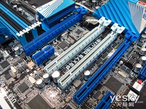 华硕 P9X79 Deluxe提供了4条PCI-E 3.0 X16接口和2条PCI-E 2.0 X4接口,支持双路、三路SLI以及CrossFireX多显卡技术。