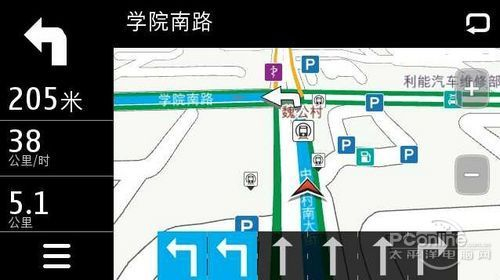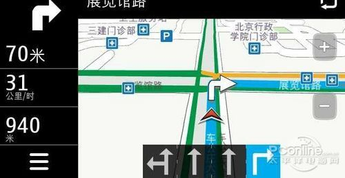 在拐弯或者便道的地方,诺基亚地图还会放大地图到最大级别,用最简单的3D导航模式(其实是看起来有点立体的感觉)告诉你在哪里转弯,往哪个方向转,离转弯还有多少米,目前的道路是什么路等等相信信息。最能体现导航功能好不好的地方,就看这个导航软件有没有在关键时刻带你走关键的路。而这一点,诺基亚地图就做到了。