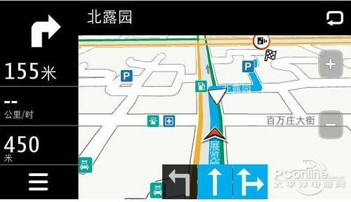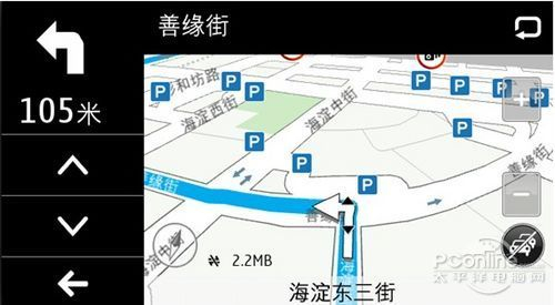 如图3所示,在海淀东三街往善缘街左转的导航上,提前105米提示左转,并用立体箭头告诉用怎么转。在导航的同时,诺基亚地图会实时显示用户想显示的一些信息,例如停车场和拍照点,如果你想显示一些吃饭的地方或者购物商城,设置相关功能即可。
