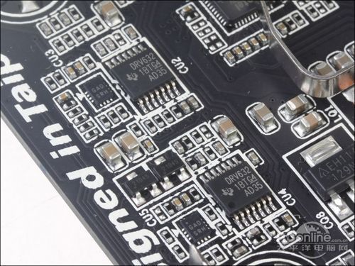技嘉 G1.Sniper M3的创新Core 3D声卡设置在主板左下角,整体占用了不少位置,而为了减少信号干扰,这部分电路元件使用一块金属片与其他部分阻隔开来。