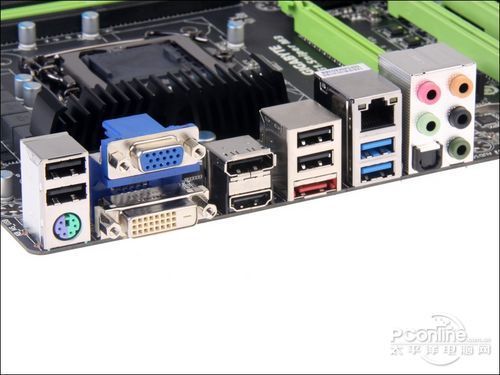 这款主板的I/O接口比较丰富,包括4个分离式设计的USB2.0,1个PS/2键鼠接口、VGA+DVI+HDMI+DP全视频输出、E-SATA接口、RJ-45网线接口、2个USB3.0接口和带光纤输出的混合式8声道音频接口。