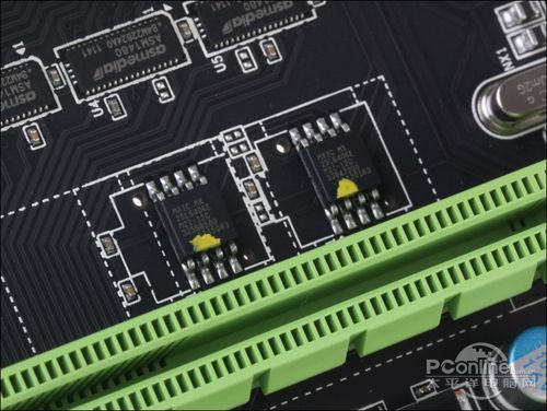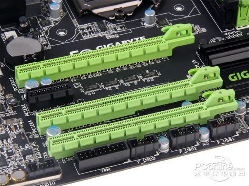 这款主板配备4条扩展插槽,其中3条是PCI-E x16显卡插槽,1条是PCI-E x1扩展插槽。3条显卡插槽中,上面两条是由CPU提供的,支持PCI-E 3.0标准,可以用于组建高性能的双卡SLI/交火,另外一条则由主板芯片提供,支持PCI-E 2.0 x4模式运作。