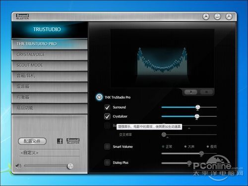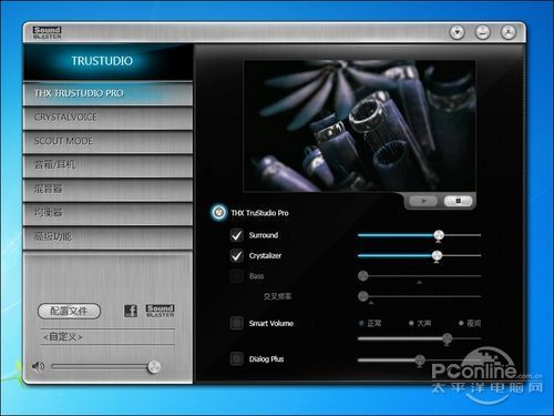 创新Core3D声卡的驱动似乎比以前的创新声卡简化了很多,第一个界面是THX TRUSTUDIO PRO音效,可以调整环绕效果(Surround)、保真音效(Crystalizer)、智能音量(Smart Volume)等选项,并且上方有个动画短片可以用于试音。