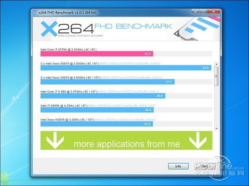 X264 是一种免费的、具有更优秀算法的符合H.264/MPEG-4 AVC视频压缩编码标准格式的编码库,它可以在相同体积下压缩出比XVID质量更好的视频文件,因此在Memcoder等软件中广为应用。本次测试使用的 软件是X264 FHD BenchMark V1.0.1,内嵌的X264转码器是64位的,转换一段平均码率近30Mbps的1080P高清视频。