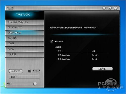 这款声卡有个挺有意思的功能叫Scout Mode,可以用于强化脚步声等细节声音,让玩家能更轻松地察觉周围动静,先发制人。此功能可以通过热键激活和关闭,在激活时此功能时THX音效会被关闭,而仅用时则会自动回到激活前的设置。