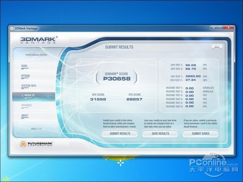 3DMark Vantage是DX10 3D性能测试软件,主要包括了Graphics Test和CPU Test两个测试部分,分别测试显卡的3D性能和CPU的AI、物理运算性能。