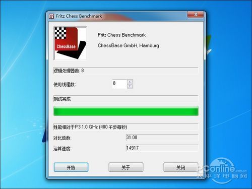 Fritz Chess Benchmark主要用于测试处理器的AI运算性能、多线程处理能力,我们采用最新的4.3版,可支持12线程。