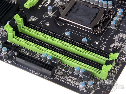 主板配备4条内存插槽,可以超频支持DDR3 2400MHz的双通道高速内存,最大支持32G容量。