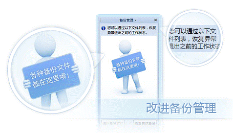 备份管理是电脑故障导致文档异常关闭时最有用的工具,在此版本中备份管理功能得到进一步改进,让你更易找到异常退出文档。