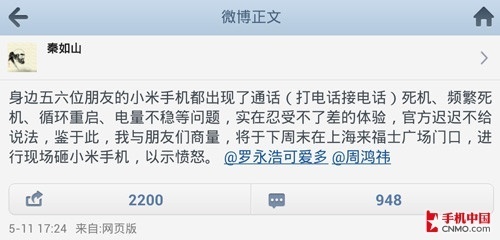 5月11日,新浪微博一位名叫@秦如山的博主发布微博称,身边多位朋友购买的小米手机(参数 报价 图片 论坛 软件)都出现了诸如频繁死机、循环重启、电量不稳等问题,而小米官方迟迟不给说法,因此他决定下周末在上海来福士广场门口现场砸小米手机,以示愤怒。