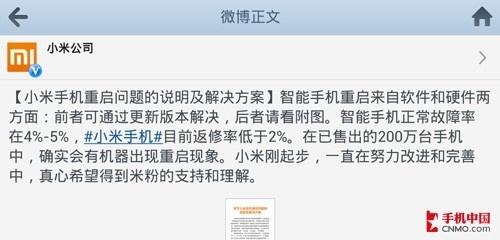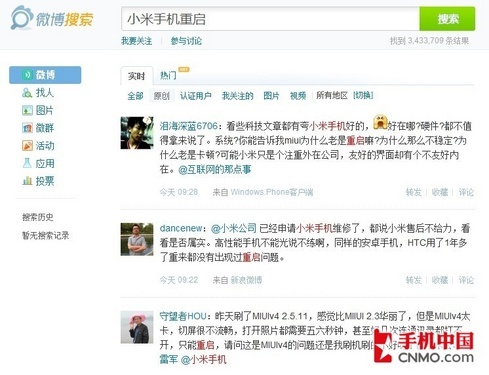 在微博上,关于小米手机质量问题的声音屡见不鲜,甚至有用户成立“小米民间客服部”,来收集小米手机用户放映的问题并试图反馈给小米公司。而在百度、谷歌等搜索引擎,搜索如“小米手机重启”、“小米手机烧SIM卡、小米手机电池触点不良”等较为典型的问题,页面反馈都在百万个以上!在手机中国的论坛上,也有不少用户发帖反映购买的小米手机存在这样那样的问题。这对于刚卖了200多万部的小米来说,就不是什么好事情了。