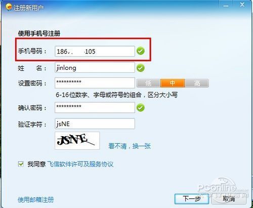 看到飞信晨曦版开放注册之后,笔者马上使用联通号去注册一个飞信号!注册过程非常愉快,在填入资料之后,再填入手机验证码即可。
